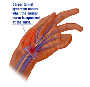 Carpal Tunnel Syndrome (CTS) is a common problem affecting hand function, caused by compression of the median nerve at the wrist. It most often occurs when the median nerve in the wrist becomes inflamed after being aggravated by repetitive movements, such as typing on a computer keyboard, talking on the phone (holding phone to the ear), texting or playing the piano. It also affects professional artists (sculptors, printmakers, violinists) or any job requiring long-term repetitive motion of the wrist (jackhammer use, certain factory positions).